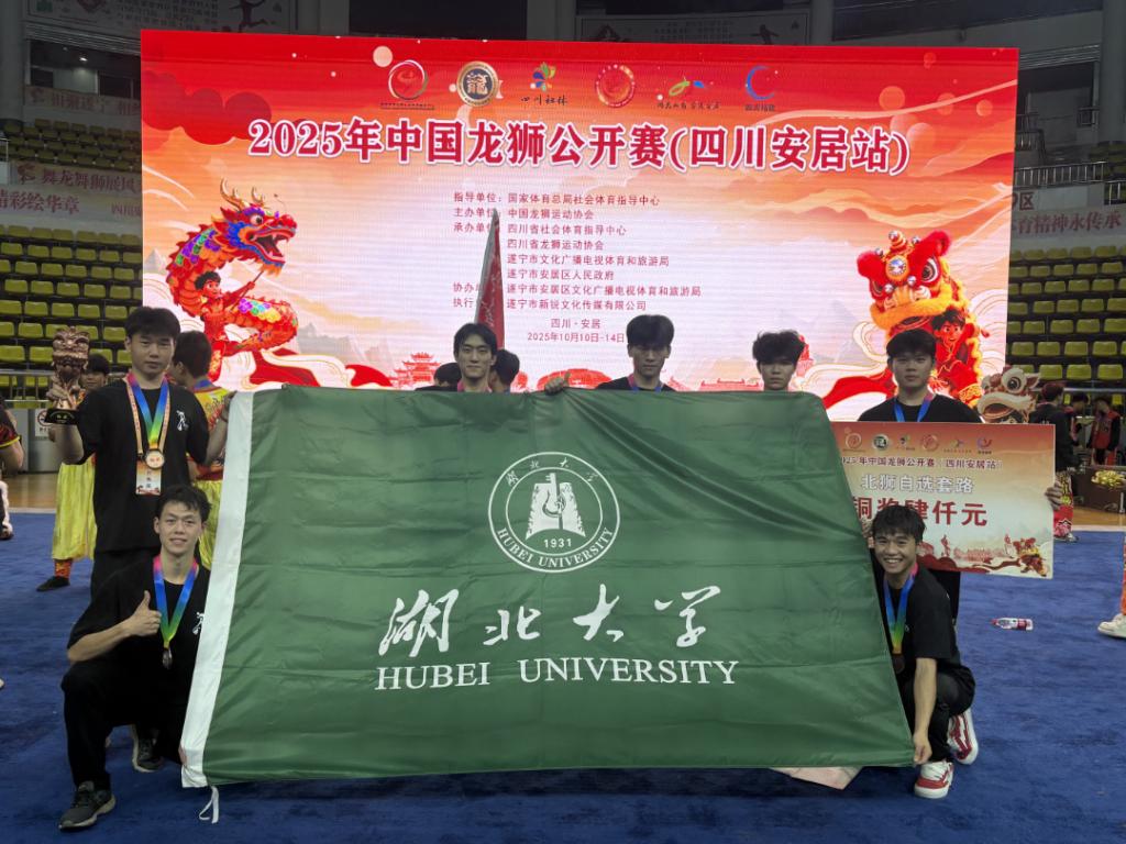 在领队梅林琦老师,教练员向辉、刘雯飞的带领下,我校龙狮团北狮队6名队员(邓灿、朱俊洋、胡涛、李仁杰及桂一波)出战北狮自选项目。历经两天激烈角逐,队员们配合默契,将北狮灵动神韵展现得淋漓尽致——整套动作融合狮戏与引狮员技巧,在民族音乐伴奏下,狮子扑、跃、翻、滚等动作行云流水,既精准攻克技术难点,又兼具艺术感染力,最终斩获该项目第三名,荣获铜奖,赢得现场观众阵阵掌声。
